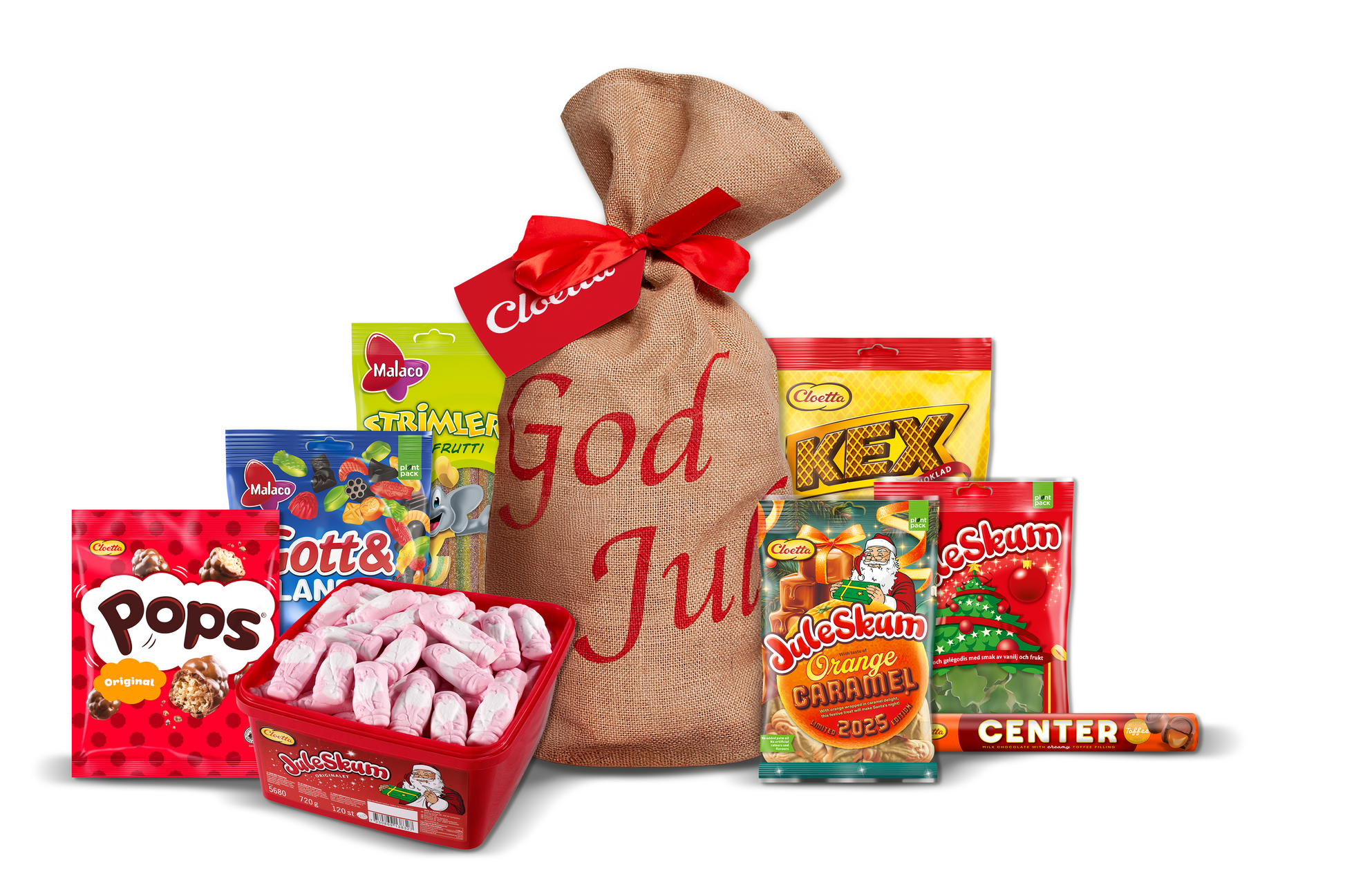 Ge bort denna fina jutesäck fylld med godis till anställda, kunder eller leverantörer och önska en riktigt God Jul. Säcken innehåller Juleskum 720 g, Juleskum Orange Caramel 100 g, Juleskum Granar 100 g, Gott & Blandat Original 400 g, Center 78 g, Pops 210 g, Strimler Tutti Frutti 80 g och Kexchoklad Mini 150 g. Totalt 1838 g godis som garanterat kommer uppskattas av alla som får den. Levereras från vecka 45 och packas 6 julsäckar per kartong.